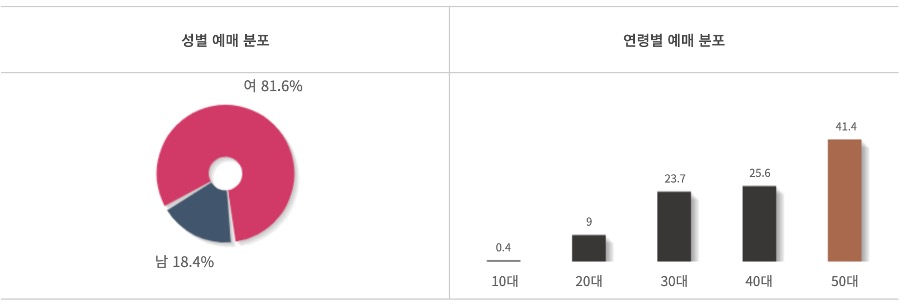 CGV의 발표에 따르면, 성별 예매 분포를 보면 여자가 81.6%로 압도적이네요. 남자는 18.4%입니다. 연령은 50대 이상이 41.4%를 차지하고 있어요. 40대는 25.6%, 30대는 23.7% 등입니다.