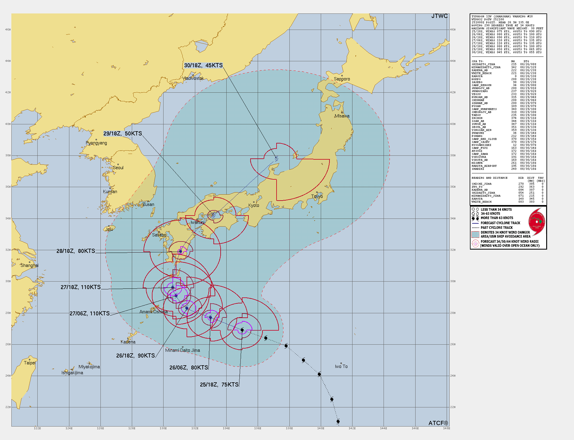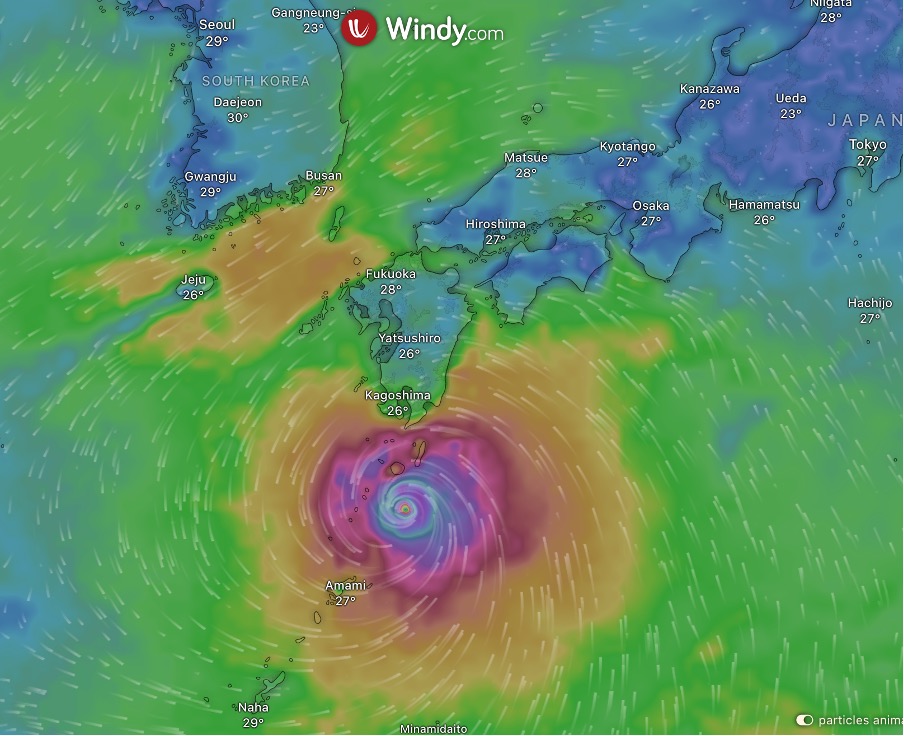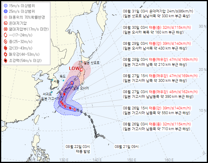 이후 더욱 발달하면 북상할 것으로 보이는데요, 8월 28일 오전 3시 경에는 강력한 태풍을 발달할 것 같습니다. 경로는 아마미제도 북동, 야큐시마 남쪽까지 진출할 것으로 보이는데요, 중심기압은 950hPa, 중심부근의 최대 풍속은 초속 45m, 순간 최대풍속은 초속 60m입니다.