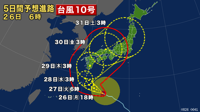 이 정도면 가옥이 무너질 정도인데요, 이후에도 강력한 세력을 유지한 채 진로를 동쪽으로 틀어 8월 29일 오전 3시에는 시코쿠 남부를 강타한 뒤, 오사카 지역을 거쳐 8월 30일 오전 3시에는 동해로 빠져 나갈 것으로 보입니다. 일본 NHK의 예보는 다음과 같습니다.