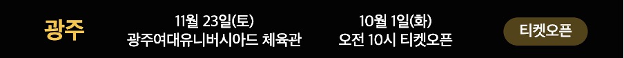광주 공연은 11월 23일(토)에 광주여대 유니버시아드 체육관에서 개최됩니다. 티켓은 10월 1일(화) 오전 10시에 오픈합니다. 전라남북두에서 많은 사람들이 몰릴 것으로 예상되는데요, 예매 사이트는 다음과 같습니다.