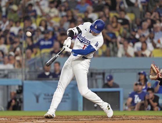 다저스는 내셔널리그 서부지구 1위인데요, 이날 LA에서 아메리칸리그 동부지구 수위인 가디언스와 3연전 첫 경기를 치렀습니다. 오타니 선수는 1번 지명타자로 선발 출전해 2점 뒤진 6회 세번째 타석에서 직구를 받아쳐 담장을 넘겼습니다.