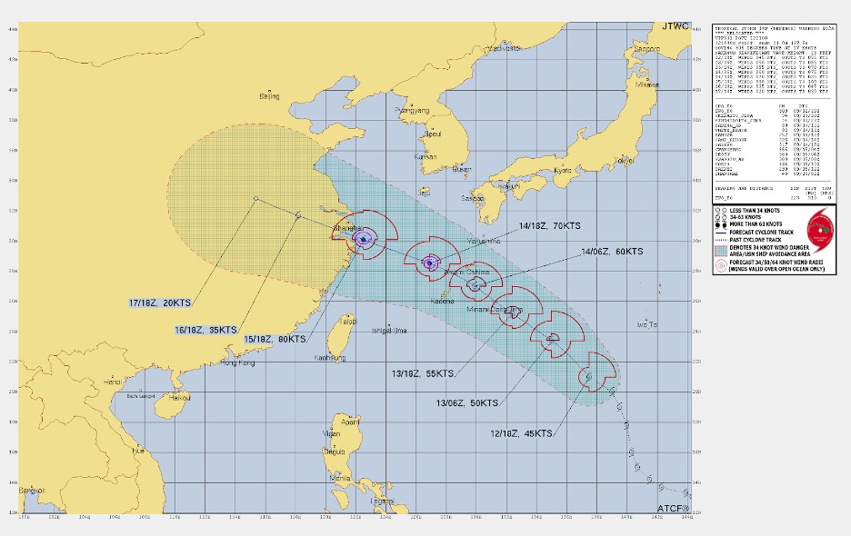 9월 15일 오전에는 오키나와를 빠져나가 제주도 남해안에 이를 것으로 보입니다. 최대 풍속은 초속 23m, 순간 최대 풍속은 초속 35m으로 예상됩니다. 이후 북북서 방향으로 이동해 16일 오전에는 상하이 부근으로 상륙할 것으로 보입니다.