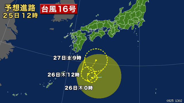 태풍의 진로는 아직 유동적인데요, 예보에 따르면 26일 12시에는 방향을 북북동으로 틀 것같습니다. 중심기압은 1002hPa, 중심 부근의 풍속은 초속 18m, 순간 최대풍속은 초속 25m입니다. 북서로 향하다 북북동 방향을 바꿔 일본 시코쿠 지방으로 접근할 것으로 보입니다.