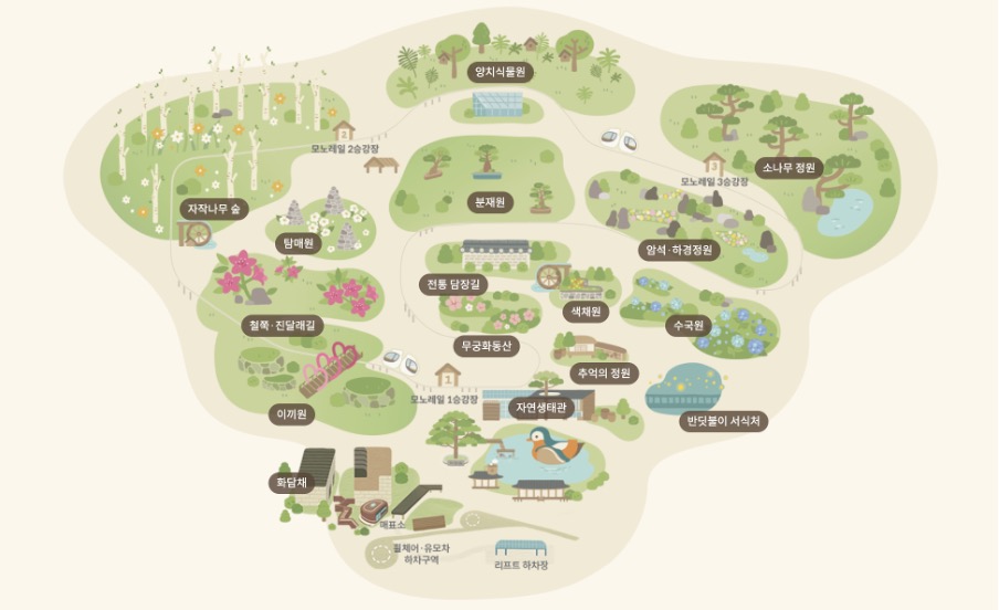 - 전체 코스: 약 2.5km의 모노레일 코스가 숲 속을 따라 이어져 있으며, 총 8개의 정차역이 있습니다. 모노레일을 통해 화담숲을 쉽게 둘러볼 수 있으며, 각 구간의 정차역에서 하차해 주요 명소를 구경하거나 다시 탑승할 수 있습니다.