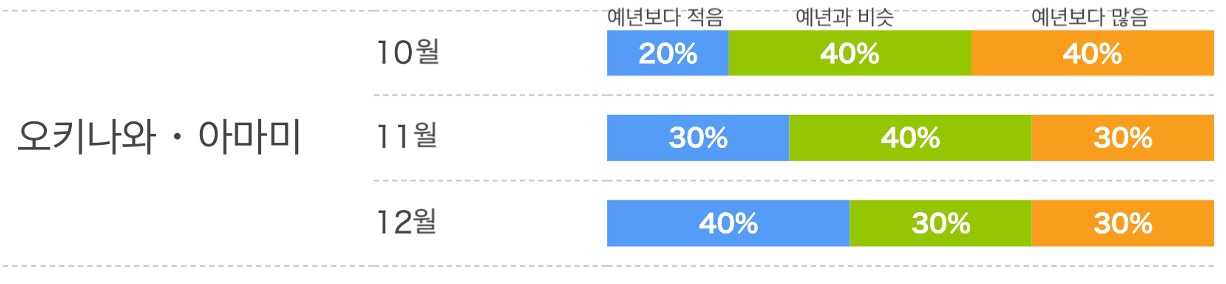 11월에는 예년과 비슷할 것으로 보입니다. 12월에는 예년보다 적거나 비슷할 것으로 보입니다. 오키나와에 강수량이 많은 달은 5월과 6월, 8월과 9월입니다. 11월부터 2월까지는 강수량이 상대적으로 적습니다. 습도도 낮아 상쾌한 날이 많습니다.