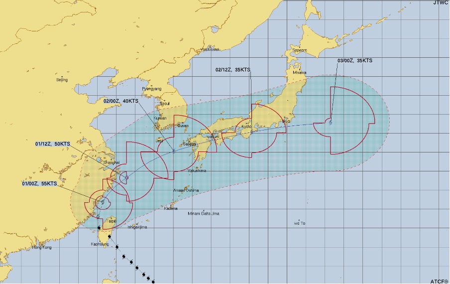 1일 12시 현재 상하이 남해까지 진출했는데요, 이후 북북동으로 이동해 2일 새벽부터 12일 사이에 제주도 남해상까지 접근할 것으로 보입니다. 이후 큐슈 지방으로 향할 것으로 예상됩니다.