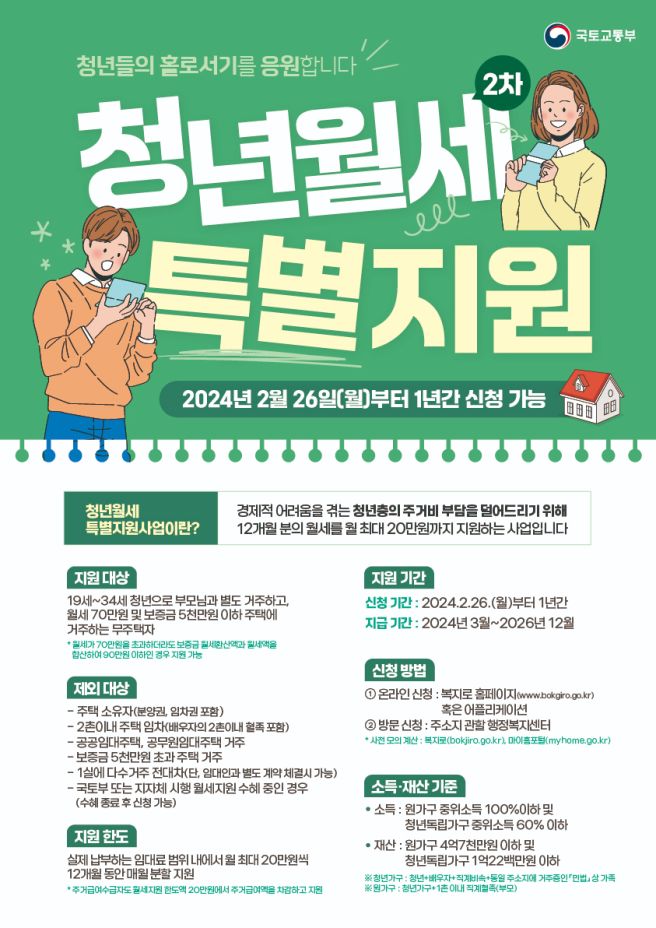 청년월세 특별지원은 최근 물가상승와 고금리로 어려움을 겪고 있는 청년들에게 주거 비용 중에 일부를 지원하는 제도입니다. 매달 20만 원씩 최대 12개월 간 총 240만 원을 지원합니다. 이번에 대상자를 확대했으니 신청자격과 신청방법 등을 확인하신 뒤, 해당한다면 직접 신청하시기 바랍니다.