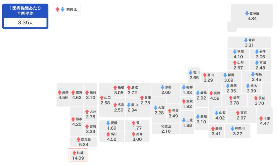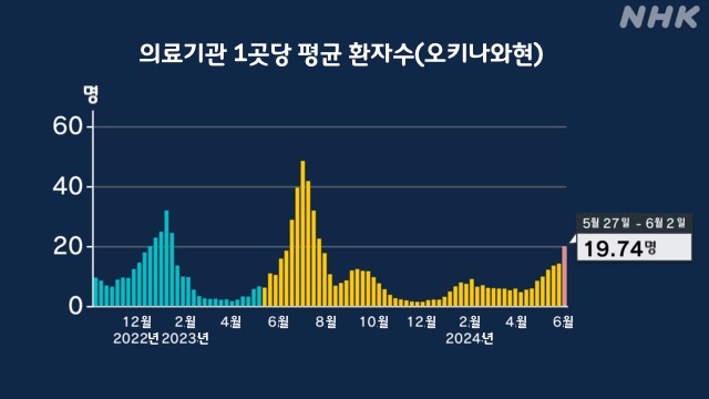 오키나와현에 따르면, 이 기간 동안 의료기관에서 보고한 코로나19 환자수는 전주보다 299명 늘어난 1,046명이었습니다. 병원당 평균 환자수는 19.74명이었습니다.