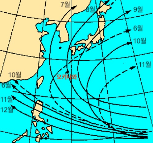 태풍이 지나가는 경로는 월별로 차이가 있는데요, 7월과 8월에 오키나와를 지나 한반도로 가거나 일본 본토로 북상하는 태풍이 많습니다. 6월에는 오키나와 남쪽이나 동쪽으로 지나가구요, 9월과 10월도 비슷한 경로로 움직입니다.