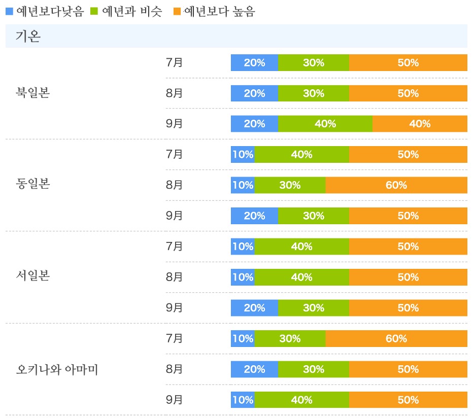 일본 기상청이 3개월 장기예보를 발표했습니다. 우선 일본 전국 평균기온은 태평양 고기압과 티벳 고기압의 영향으로 전반적으로 예년보다 높을 것으로 예상되는데요, 특히 오키나와는 높을 확률이 70%로 다른 지역에 비해 높았어요. 강수량은 서일본에서 평년보다 조금 많은 것으로 보입니다.