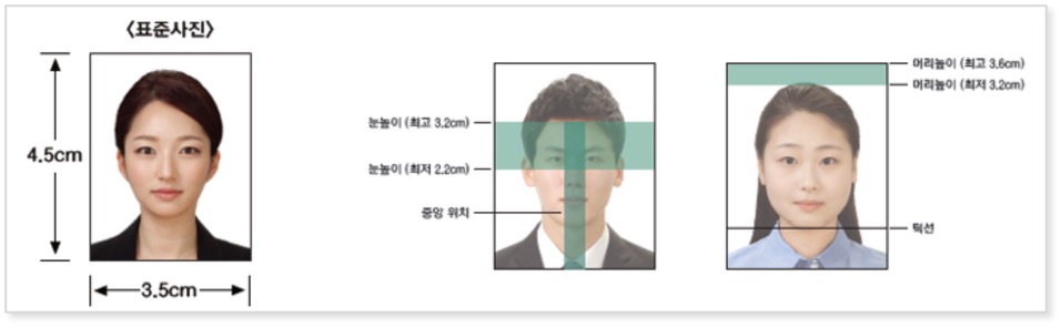 얼굴 방향은 정면을 응시해야 하며, 한쪽으로 기울면 안 됩니다. 상반신은 어깨선까지 나와야 하며, 어깨선은 수평이 되어야 합니다. 자연스러운 표정으로 입은 다문 상태이어야 합니다.
