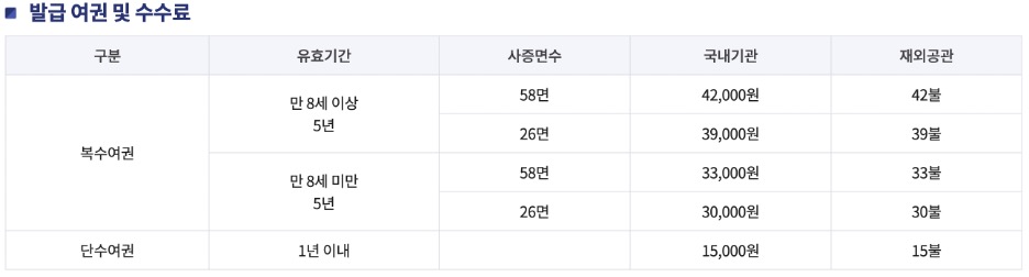 단수여권은 유효기간이 1년 이내인데요, 1회 사용할 수 있어요. 발급비용은 국내기관에서는 15,000원, 재외공간에서는 15달러입니다. 특별한 경우가 아니라면 복수여권을 발급하는 것이 좋습니다.