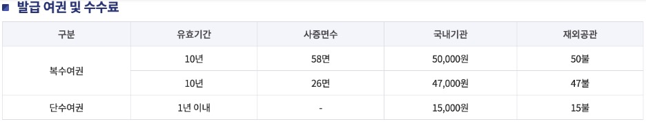 여권 발급 및 재발급 비용은 2024년 7월 1일부터 한국국제교류재단법 시령령 개정으로 복수여권의 경우 3,000원 인하되었습니다. 유효기간이 10년인 복수여권의 사증면수 58면은 국내기관에서 발급할 경우, 50,000원, 재외공관에서 발급받을 경우 50달러입니다. 사증면수가 26면인 경우 국내 47,000원, 재외공관 47달러입니다.