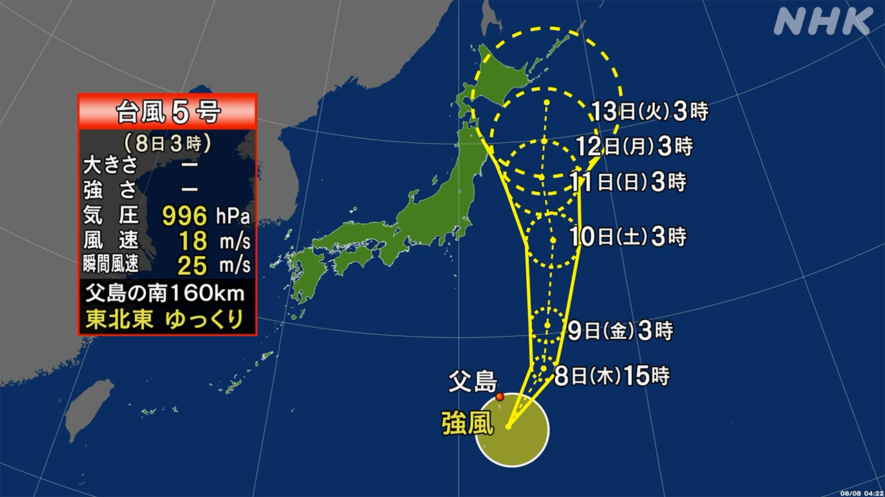 NHK 보도에 따르면, 태풍5호는 8일 오후 3시 경에 오가사와라 북동쪽까지 올라온 뒤에 북쪽으로 이동할 것으로 보입니다. 10일 오전 3시 정도가 도쿄에 가장 가까운 곳까지 진출할 것으로 보입니다.